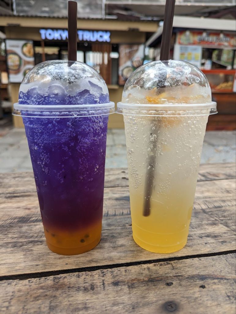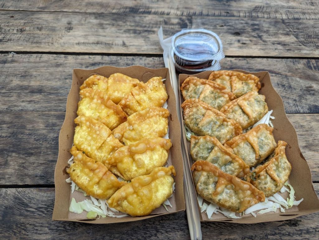Da wir Hunger haben, gibt’s Spinat/ Käse und sweet corn Gyozas mit Pommes. Dazu fancy Sodas.