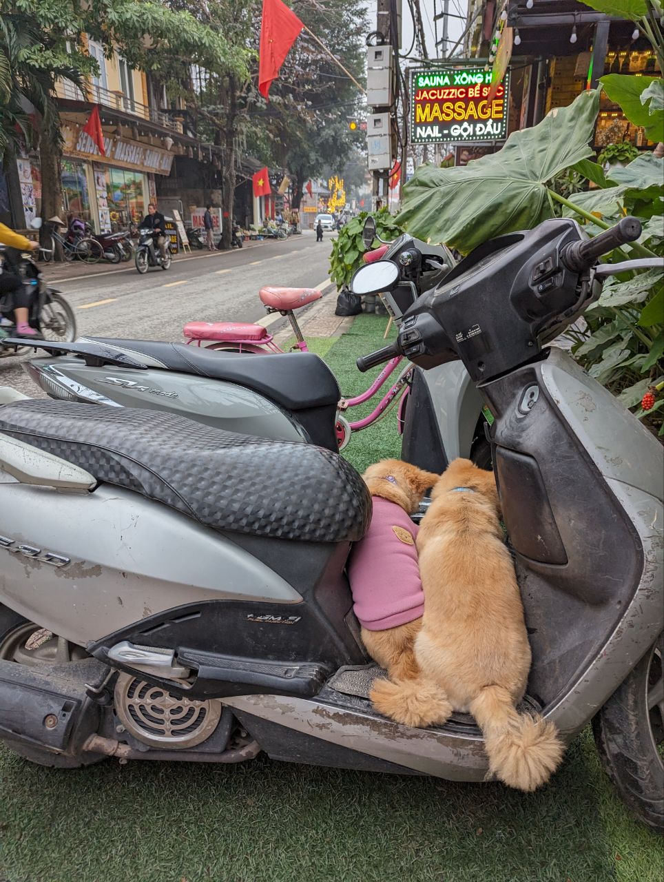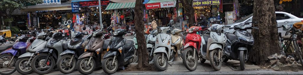 Ungefähr jede/r zweite Vietnamesin oder Vietnamese besitzt einen Roller. Vietnam ist somit (2019) der 4. größte Motorradmarkt der Welt. Allein in Hanoi gibt es über 6 Millionen Roller. Das fällt auf. Etliche Roller quetschen sich auf den überfüllten Straßen durch den stehenden Verkehr, Roller parken auf den Gehwegen, einfach überall. Verkehrsregeln? Ja, mehr oder weniger für Autos, Roller fahren nach eigenen Regeln.