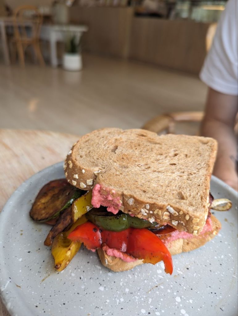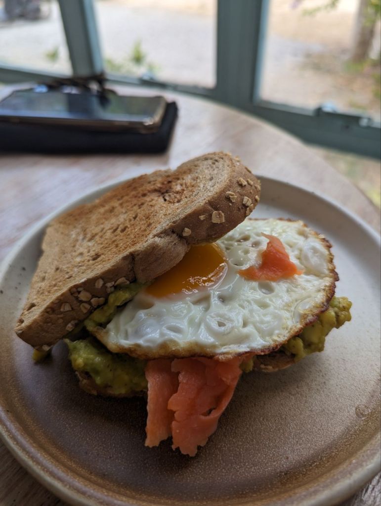 Zuerst gibt’s Frühstück im Café Smoon. Wieder Matcha Soda und Honey Lemon Americano Soda. Wieder sehr gut. Dazu Toast mit Ei, Avocado Lachs und gebratenem Gemüse und Humus.