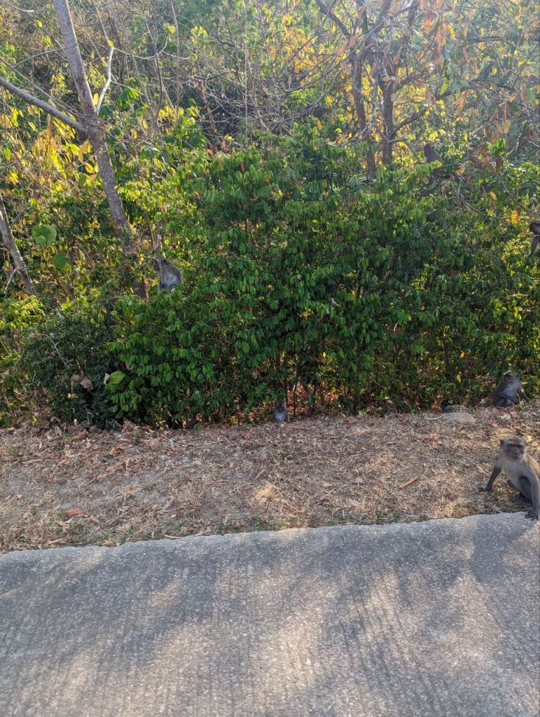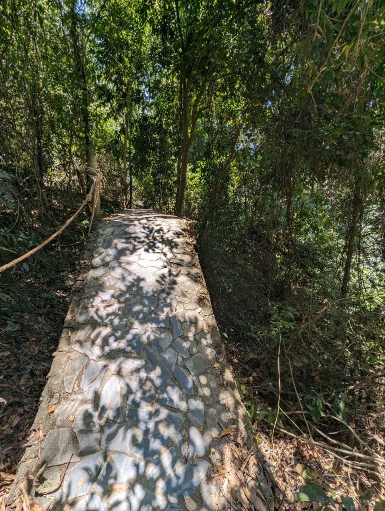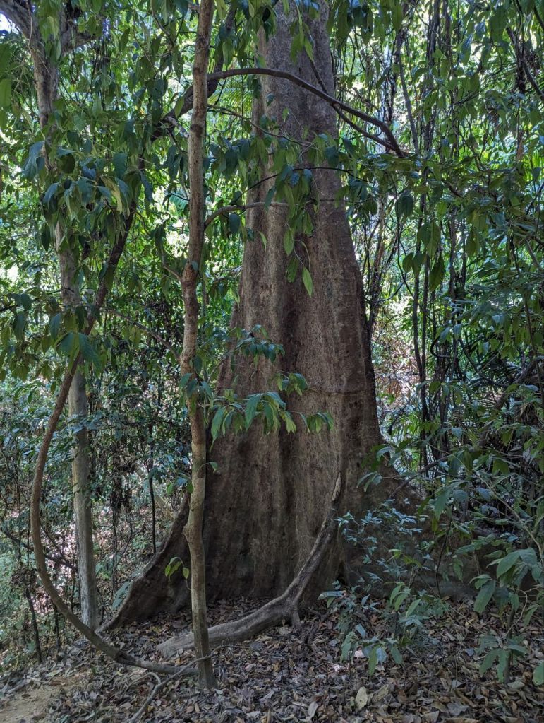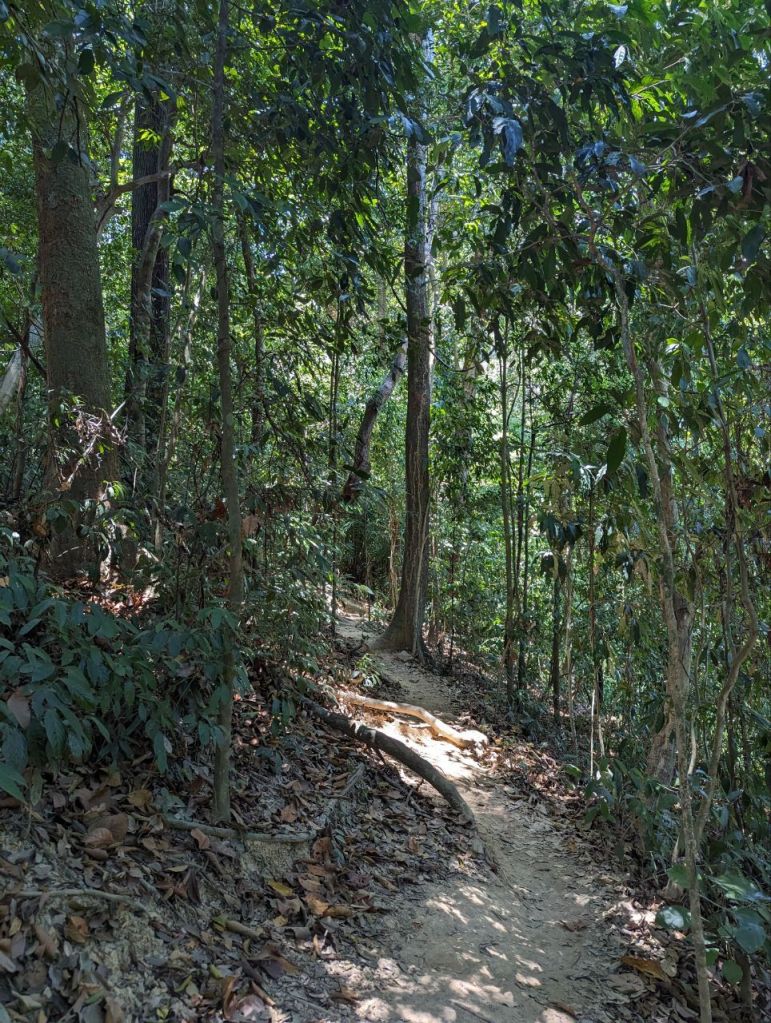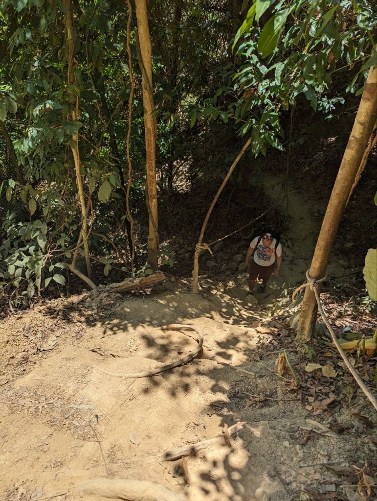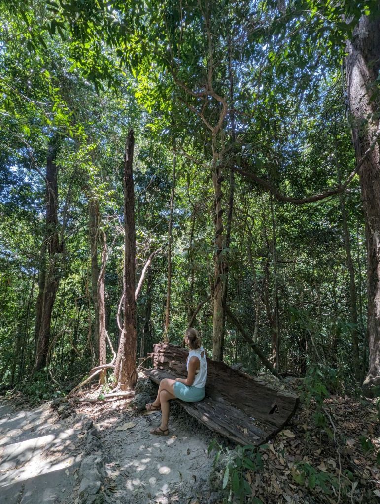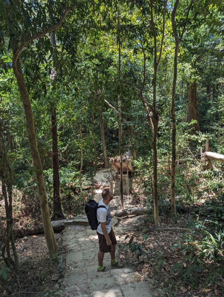 Zuerst machen wir den zwei Kilometer Dschungel Rundweg. Sehr steil, schön, aber leider keine Tiere.