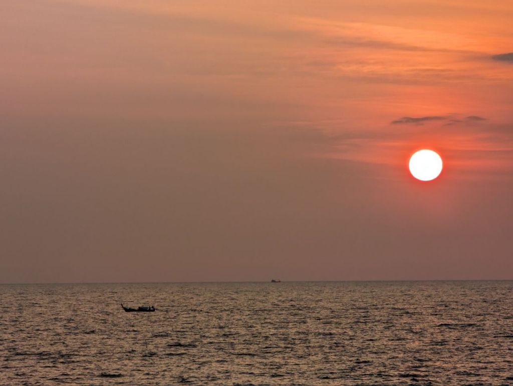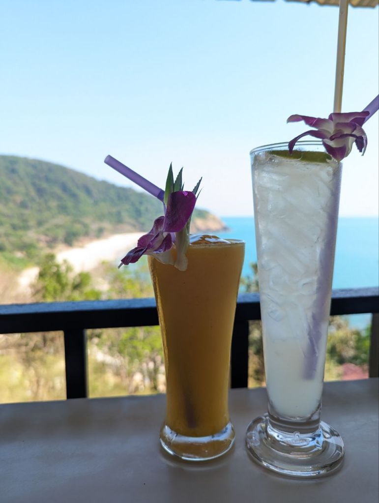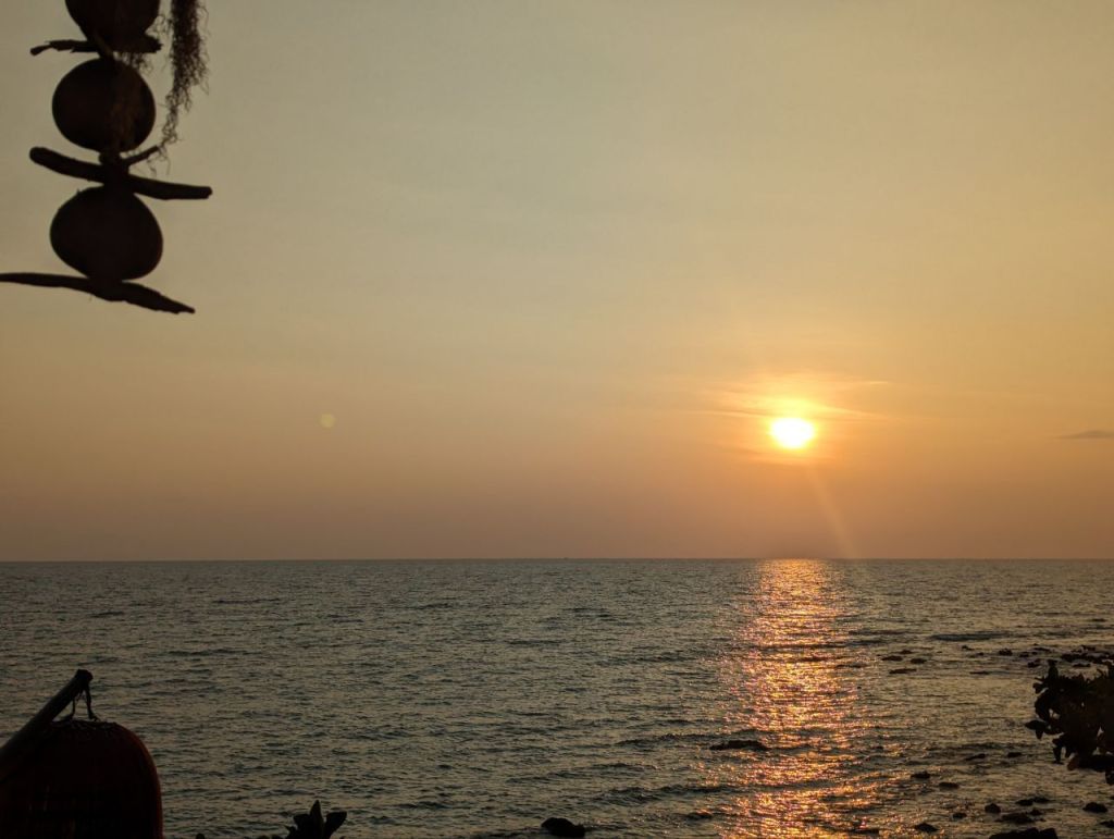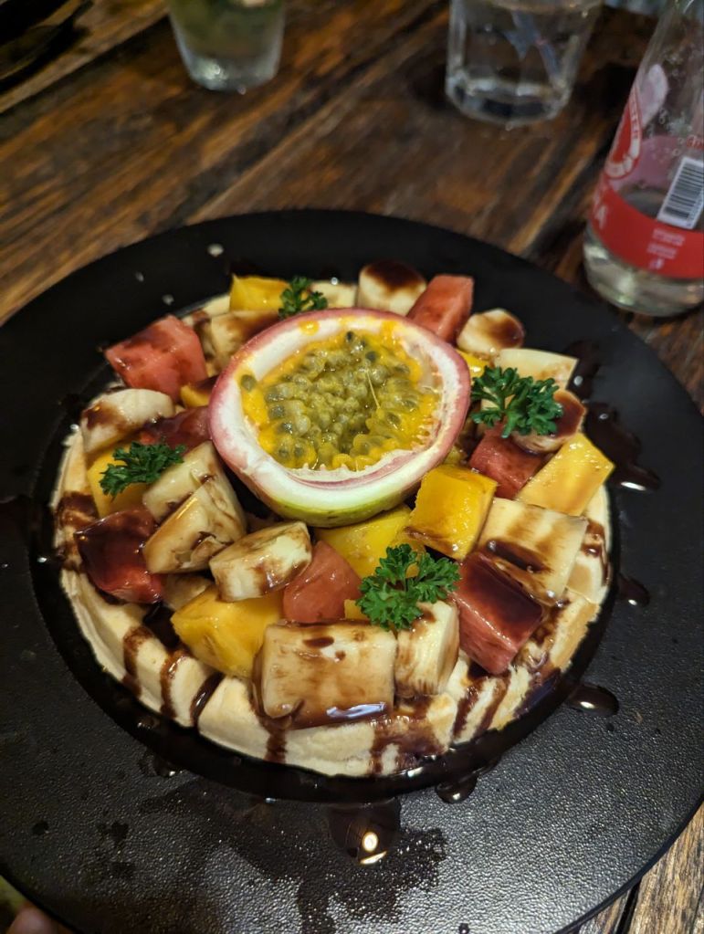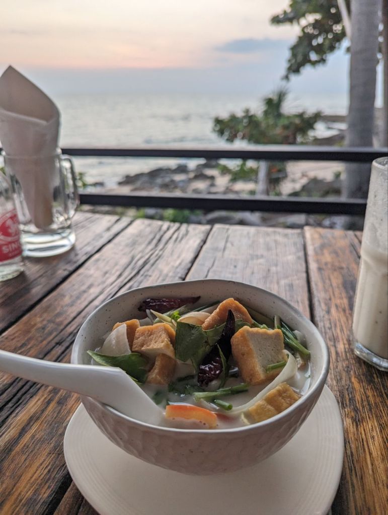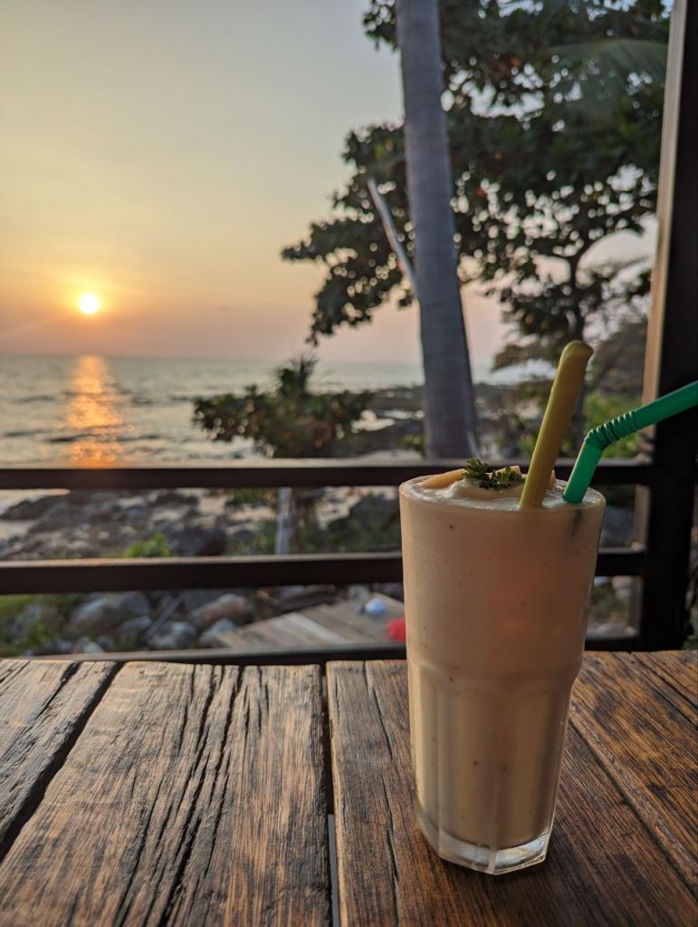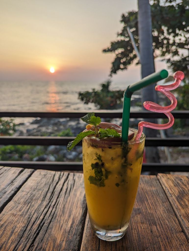 Gegen 17:30 Uhr sind wir zurück. Den Sonnenuntergang genießen wir im Coco Tango Restaurant um die Ecke. Curry und Tom Ga und Passionfruit Mojito und Shake. Zum Nachtisch Waffeln mit Obst. Waffeln okay, Obst sehr gut.