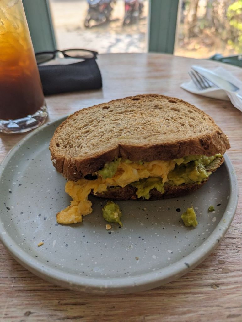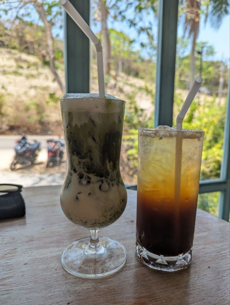 Zum Frühstück gibt’s wieder Americano Soda, Matcha Latte und ein Sandwich.