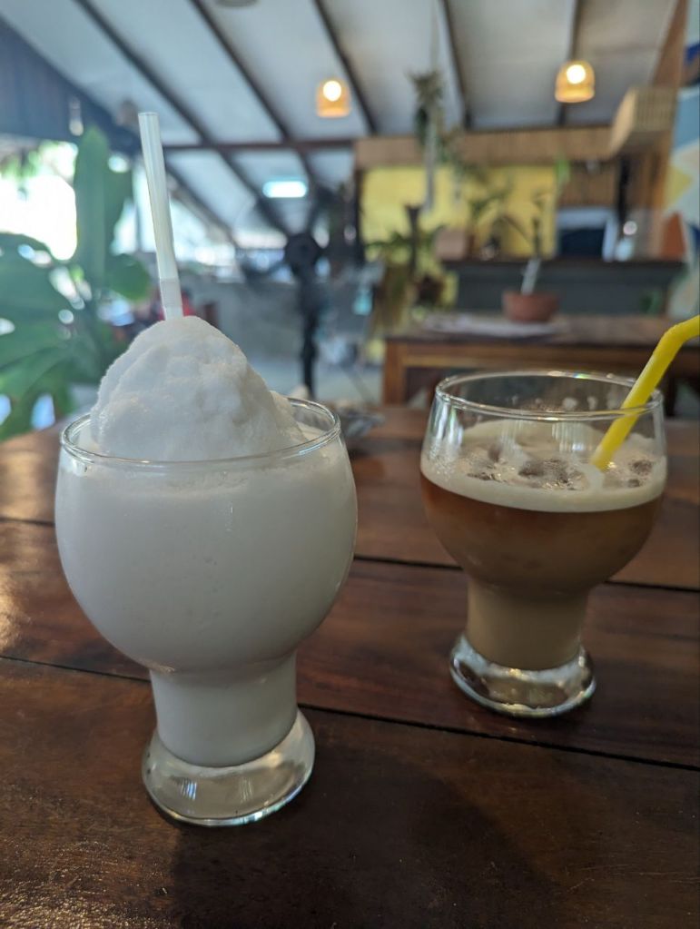 Wir gehen im Resort teuer frühstücken. Kokos Shake: 140 Baht. Dazu Kaffee für 100 Baht und Toast mit Ei und Marmelade und Obst für 180.