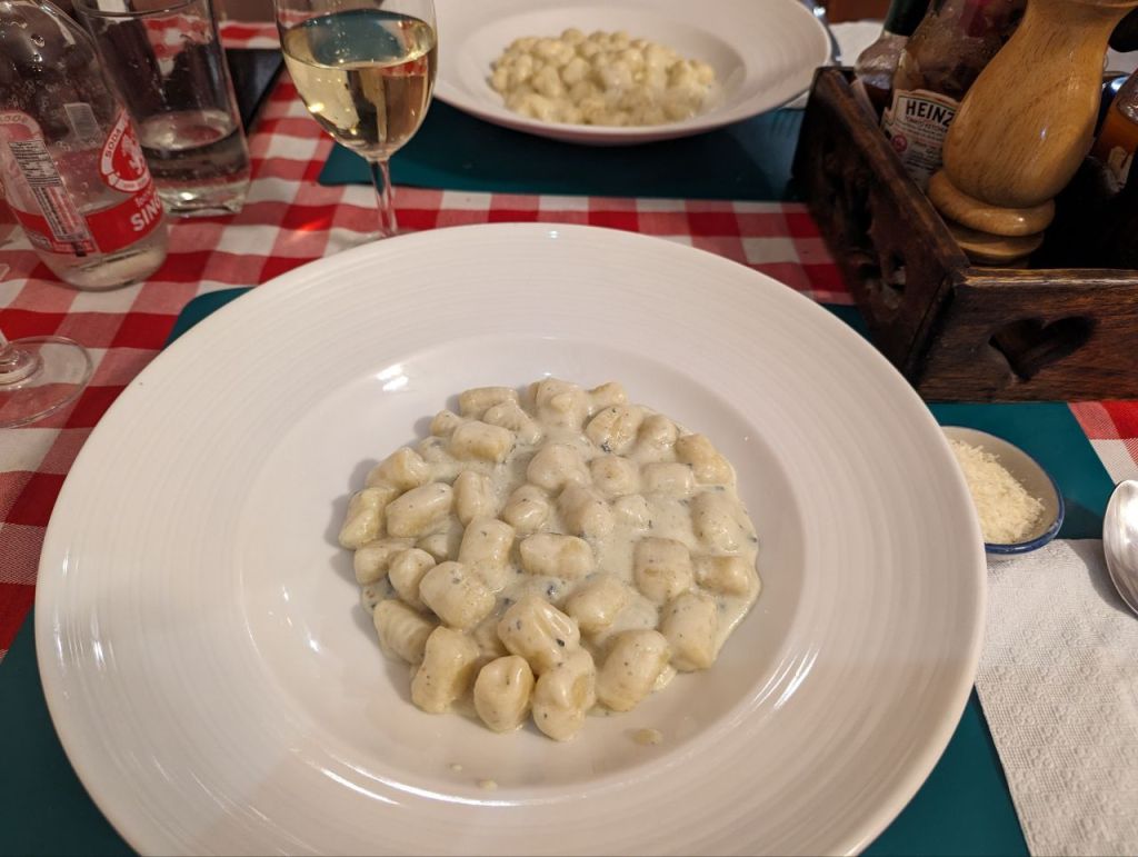 Zum Essen gibt’s Bruschetta und Gnocchi mit Gorgonzolasoße. Fett, aber lecker. Dann wird zurück ins Hotel gerollt.