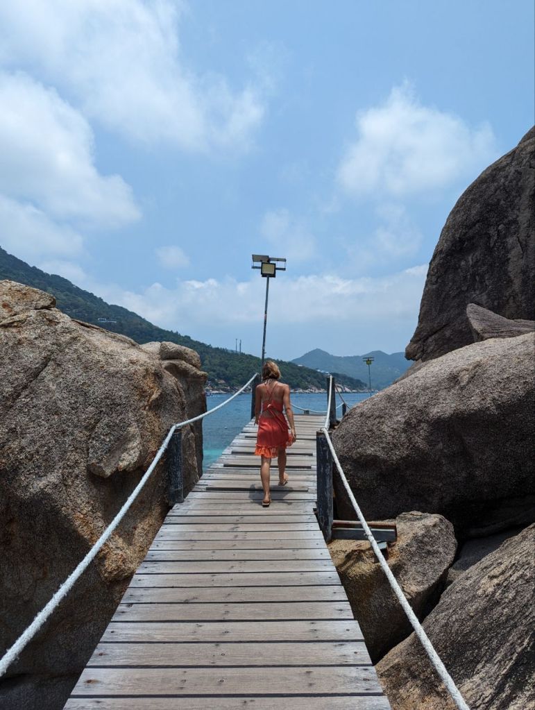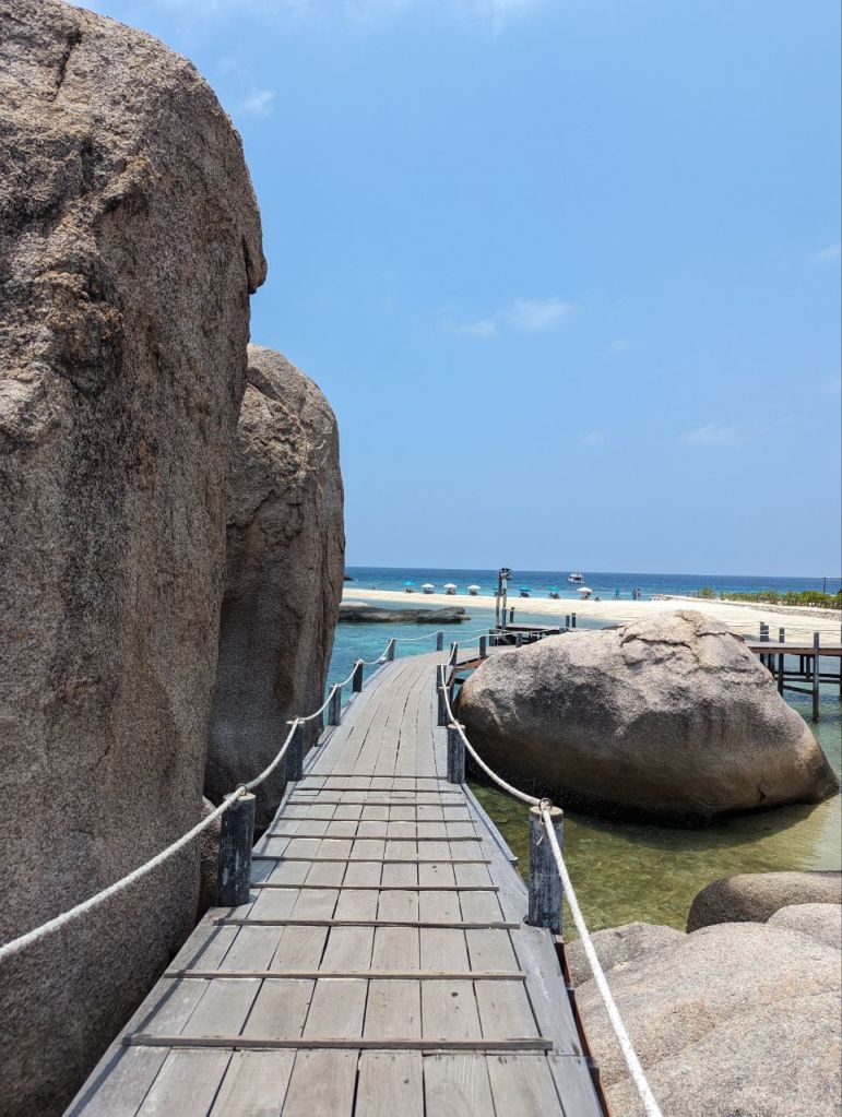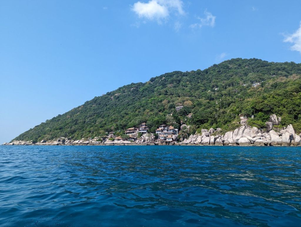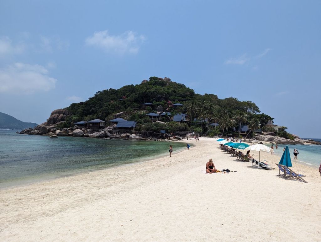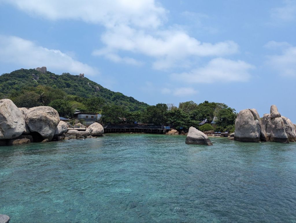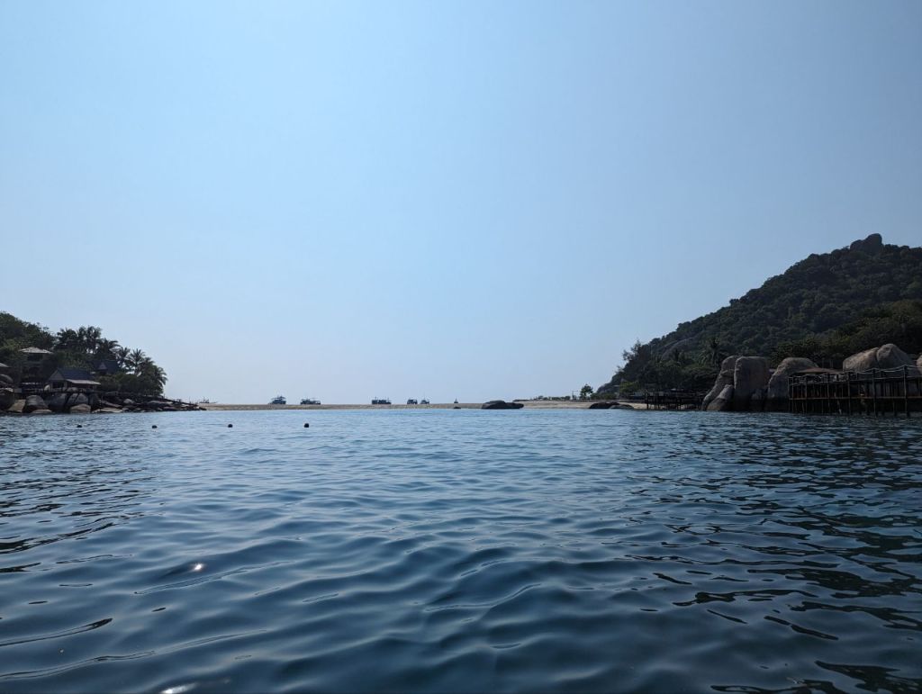 Per Taxiboot geht’s 15 Minuten zur Insel. Dort zahlen wir nochmal 250 Baht pro Person Eintritt und müssen unsere Flossen abgeben.