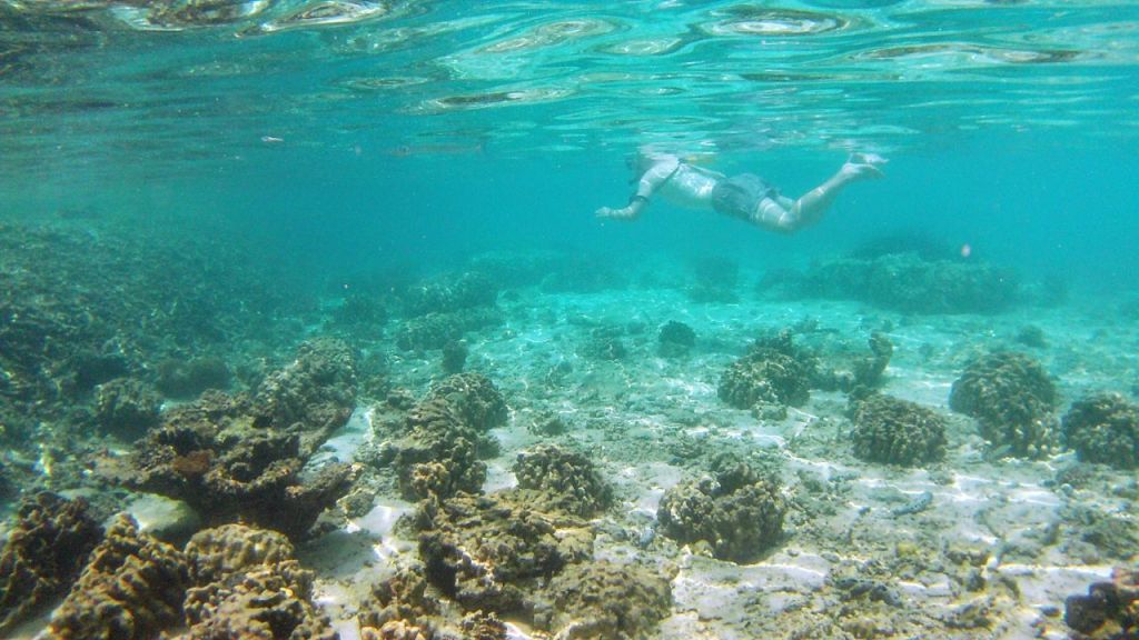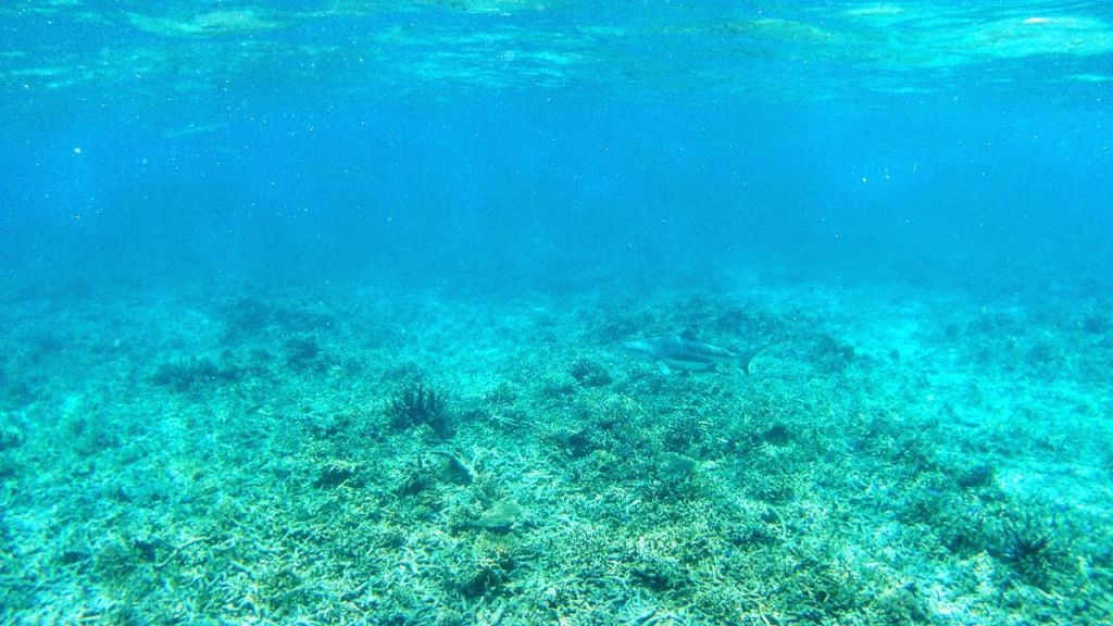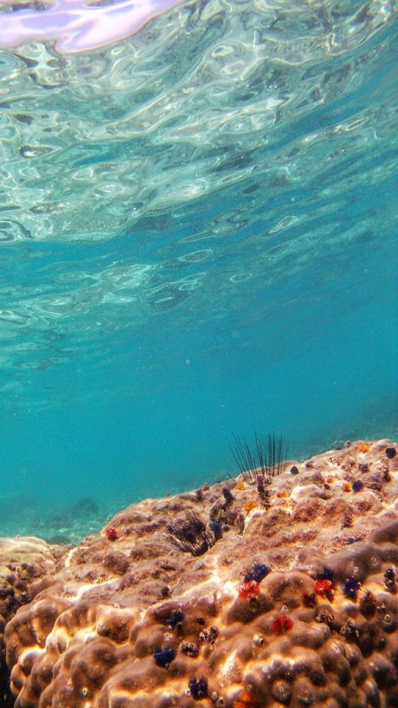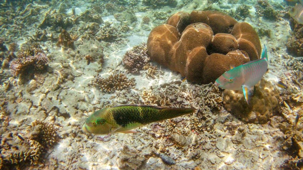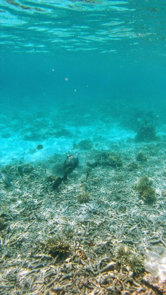 Dann geht’s ins Wasser. Das Riff ist ziemlich zertrampelt, aber weiter außen ist trotzdem viel zu sehen und das Wasser ist kristallklar. Sehr toll.