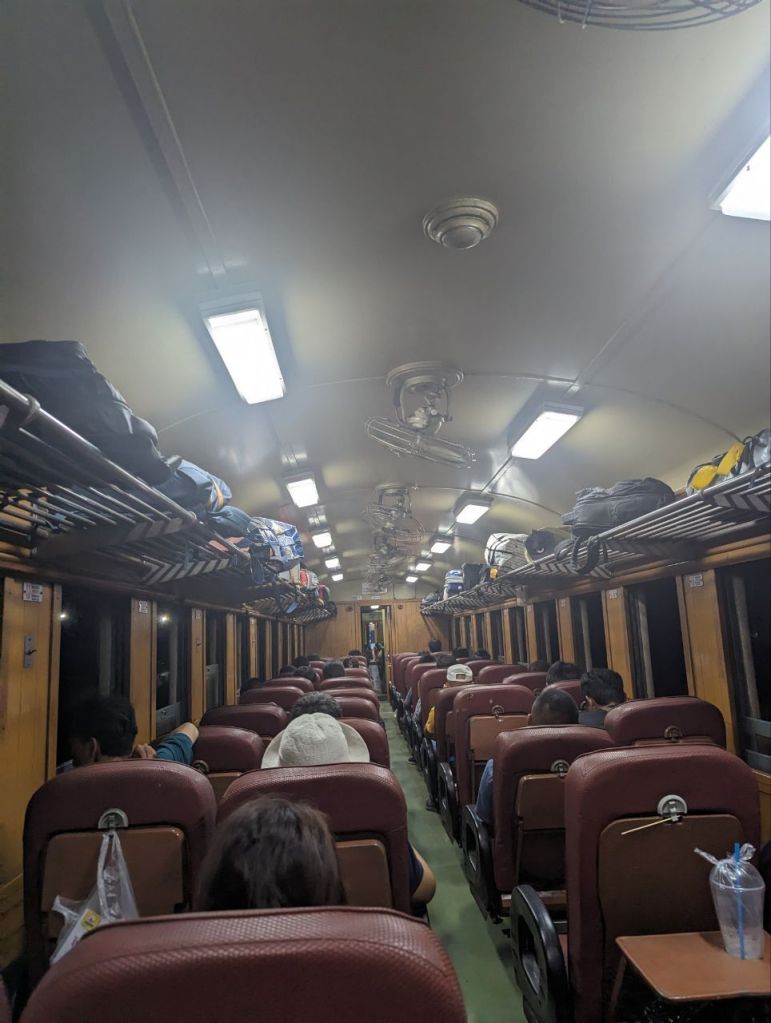 In der zweiten Klasse mit Sitzen und Ventilator sind wir die einzigen Touris in unserem Waggon. Schlafwagen oder Klima war schon vor Wochen ausgebucht. Die 3. Klasse sieht, wenn man eine Bank für sich hat, gar nicht so unbequem aus. Viel Schlaf bekommen wir trotzallem nicht.