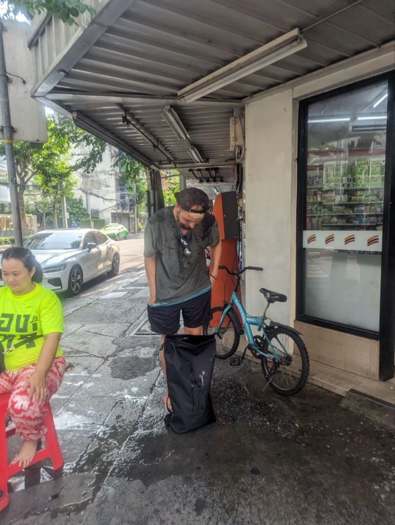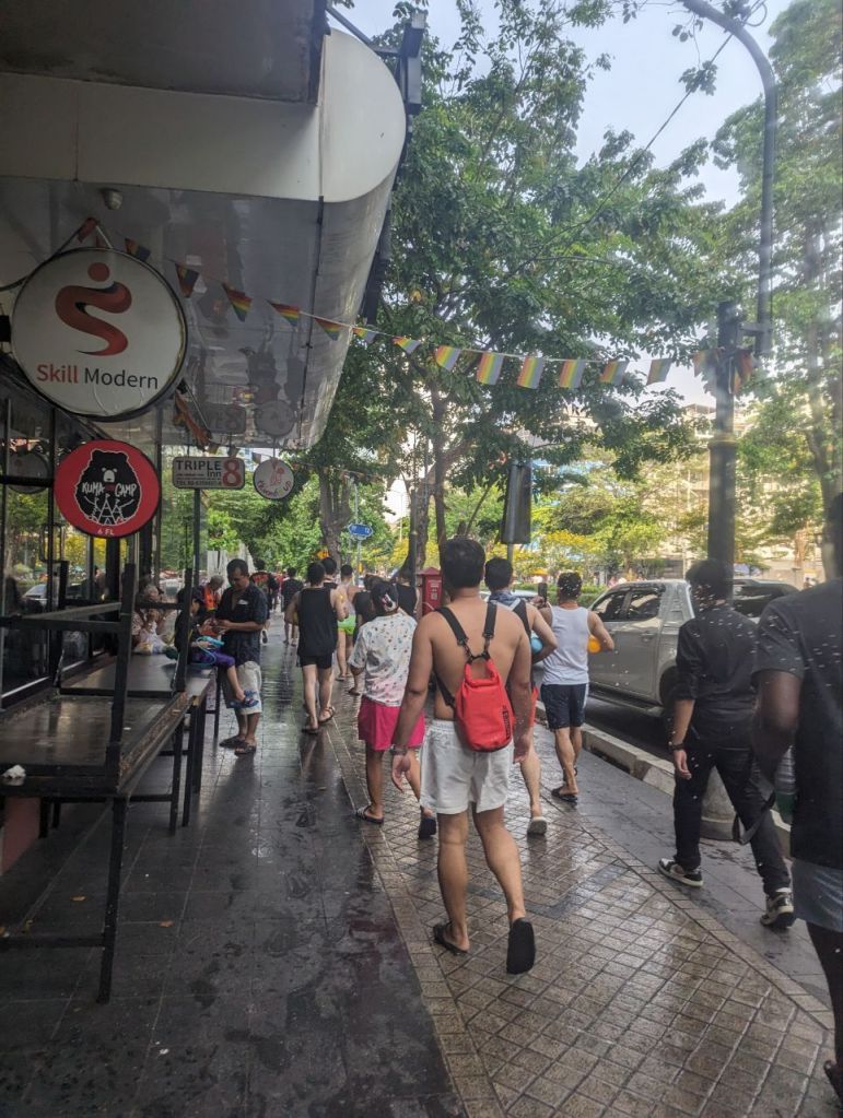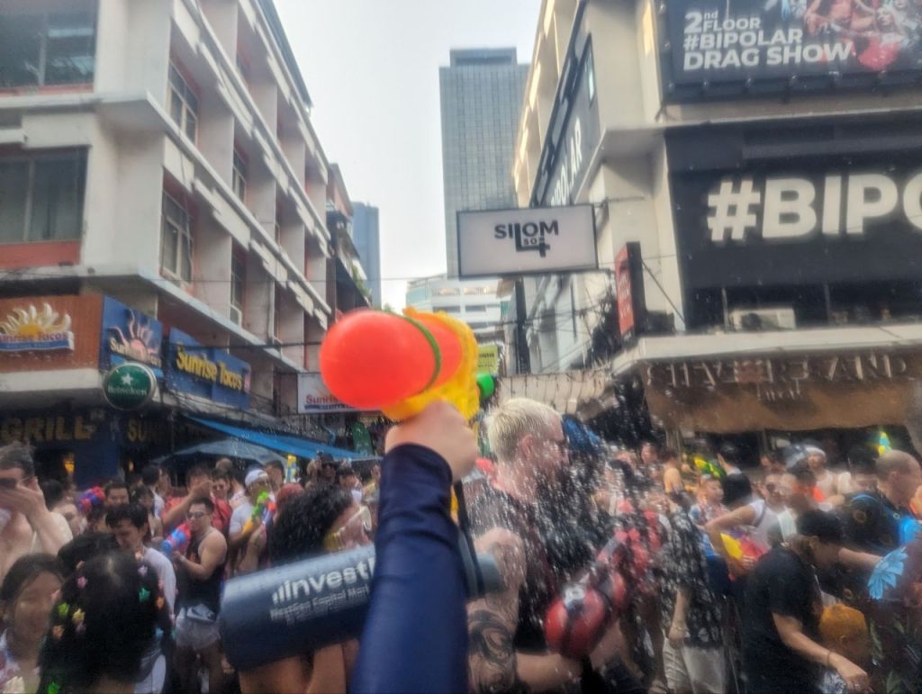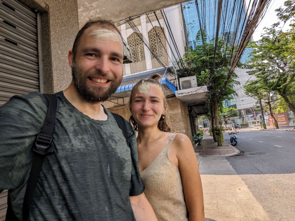 Bereits auf dem Weg zur Si Lom Road werden wir nass. Und nicht nur ein bisschen. Klein und Groß übergießen uns teilweise sogar mit Eimern. Dann gibt es noch einen Schlammpackung ins Gesicht. Und wir sind noch nicht mal bei der Partymeile 😃.