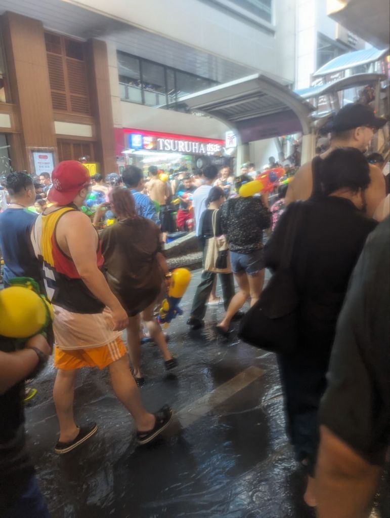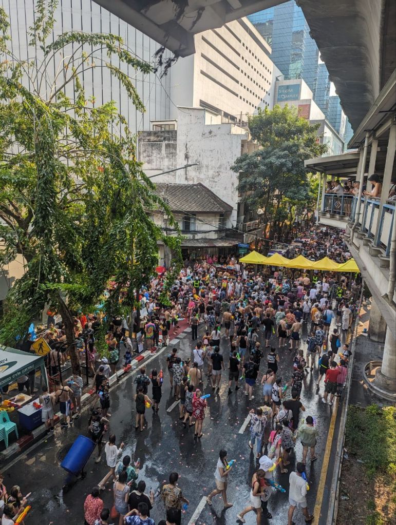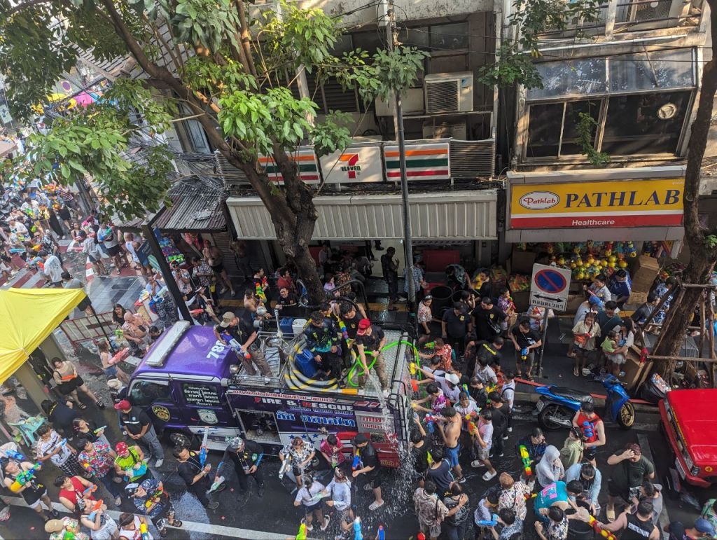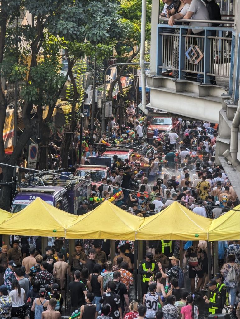 Da geht’s dann richtig ab. Die Straße ist gesperrt und 10000 Menschen führen zu lauter Musik eine riesige Wasserschlacht die Straße entlang.