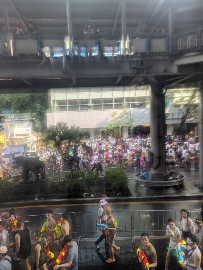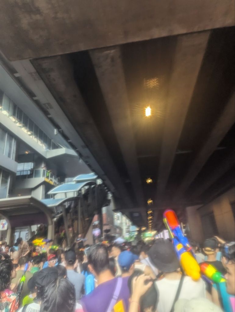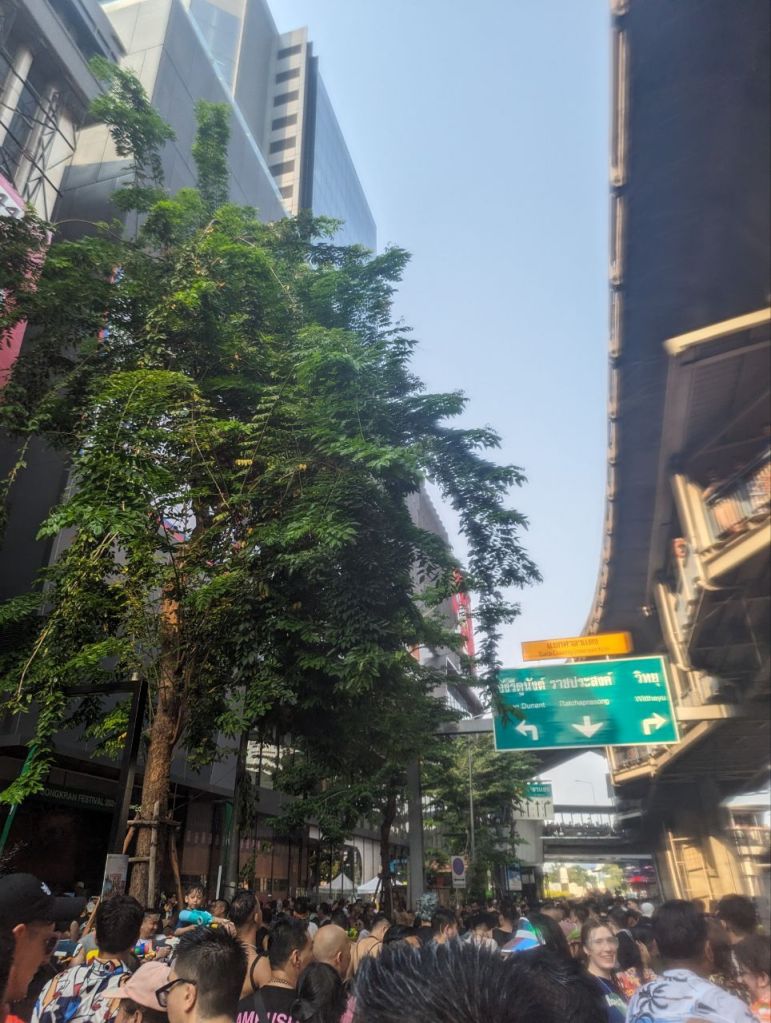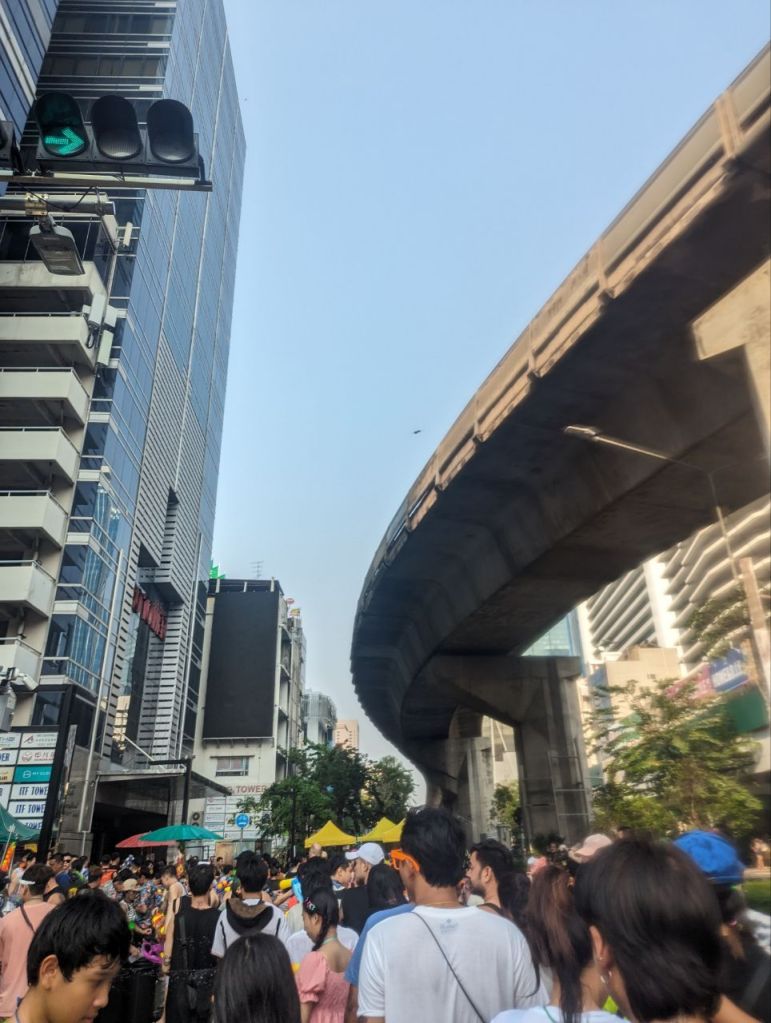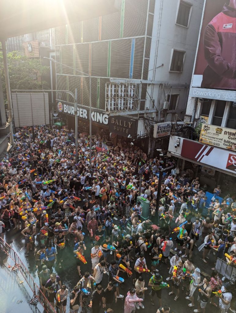 Da geht’s dann richtig ab. Die Straße ist gesperrt und 10000 Menschen führen zu lauter Musik eine riesige Wasserschlacht die Straße entlang.