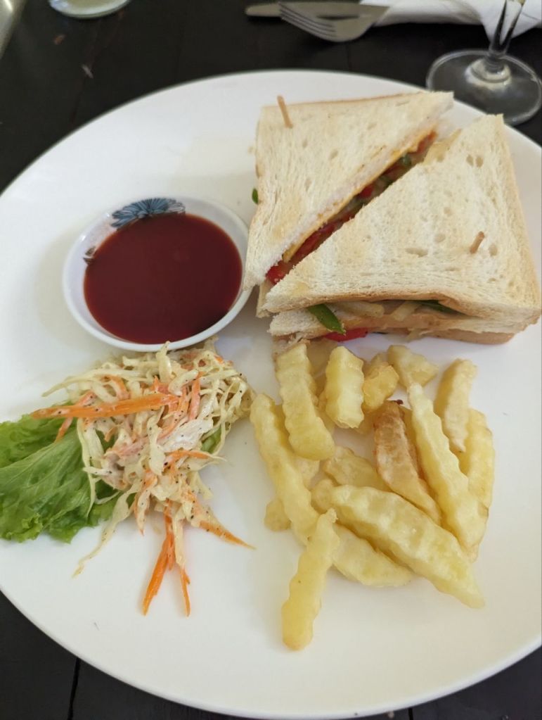 Mittags gibt’s Room Service, Sandwiches mit Pommes und Shakes. Der Toast ist gut scheiße.