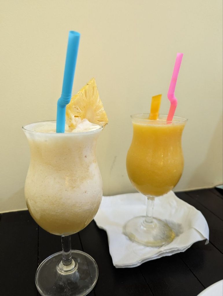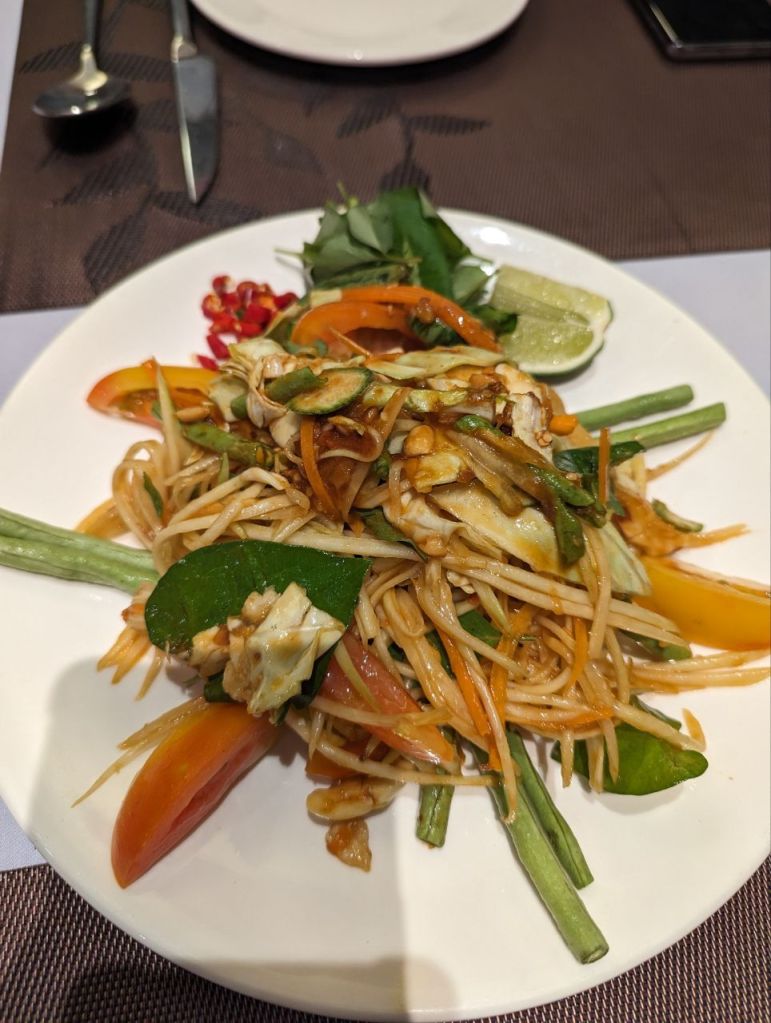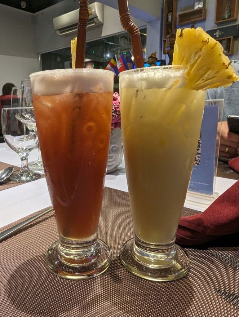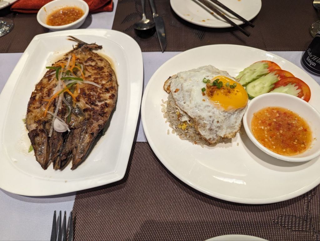 Abends gehen wir um die Ecke Essen. Sehr edel, aber gut und günstig. Es gibt grilled Sabak Fish mit garlic Fried Rice und Papayasalat. Der Fisch ist eine Art Makrele. Sehr lecker und mit zwei Cocktails alles zusammen 15 $.