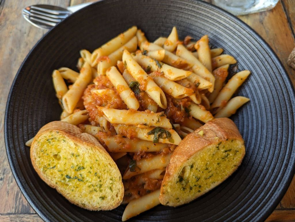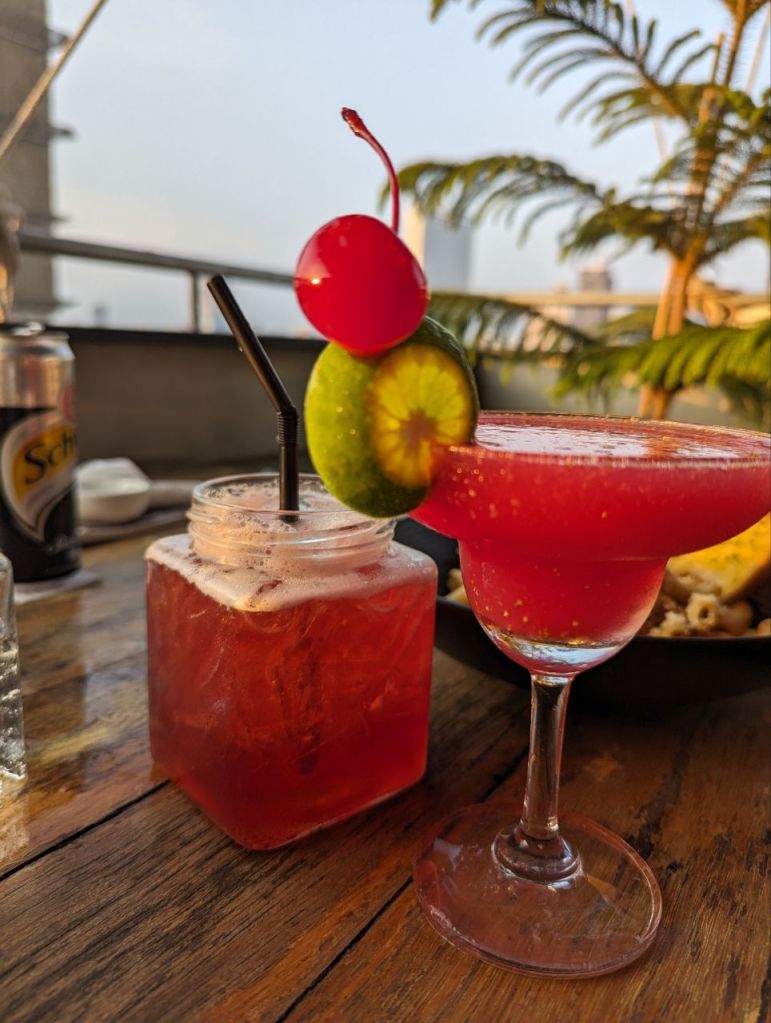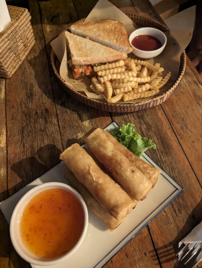 Am Nachmittag geht’s zurück ins Hotel. Es gibt nochmal Nudeln mit Tomatensoße. Abends gönnen wir uns noch einen Snack, Sandwiches mit Pommes, Veggie Frühlingsrollen und Cocktails.