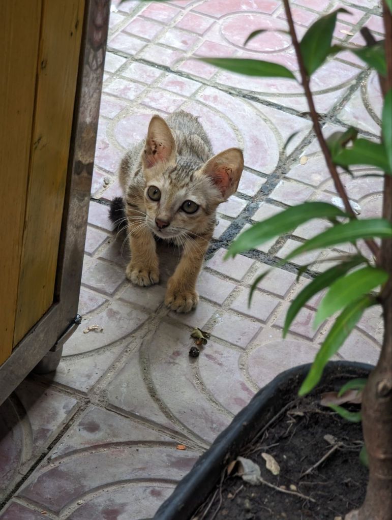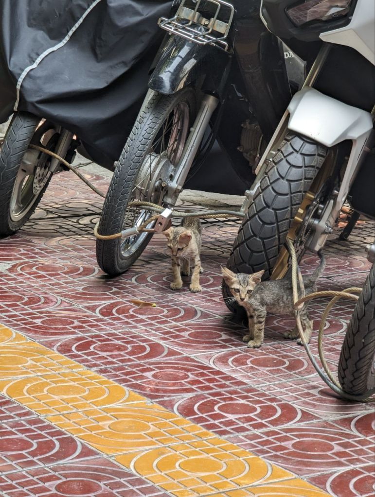 Wir gönnen uns den Late Check-out um 13 Uhr. In der Lobby warten wir auf den Bus. Der soll ab 13:45 Uhr kommen, kommt um 14:35 Uhr. Dafür haben wir beim Warten Gesellschaft von Babykatzen.