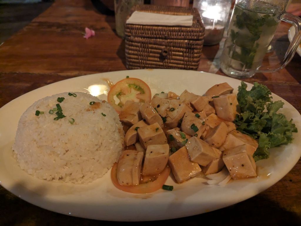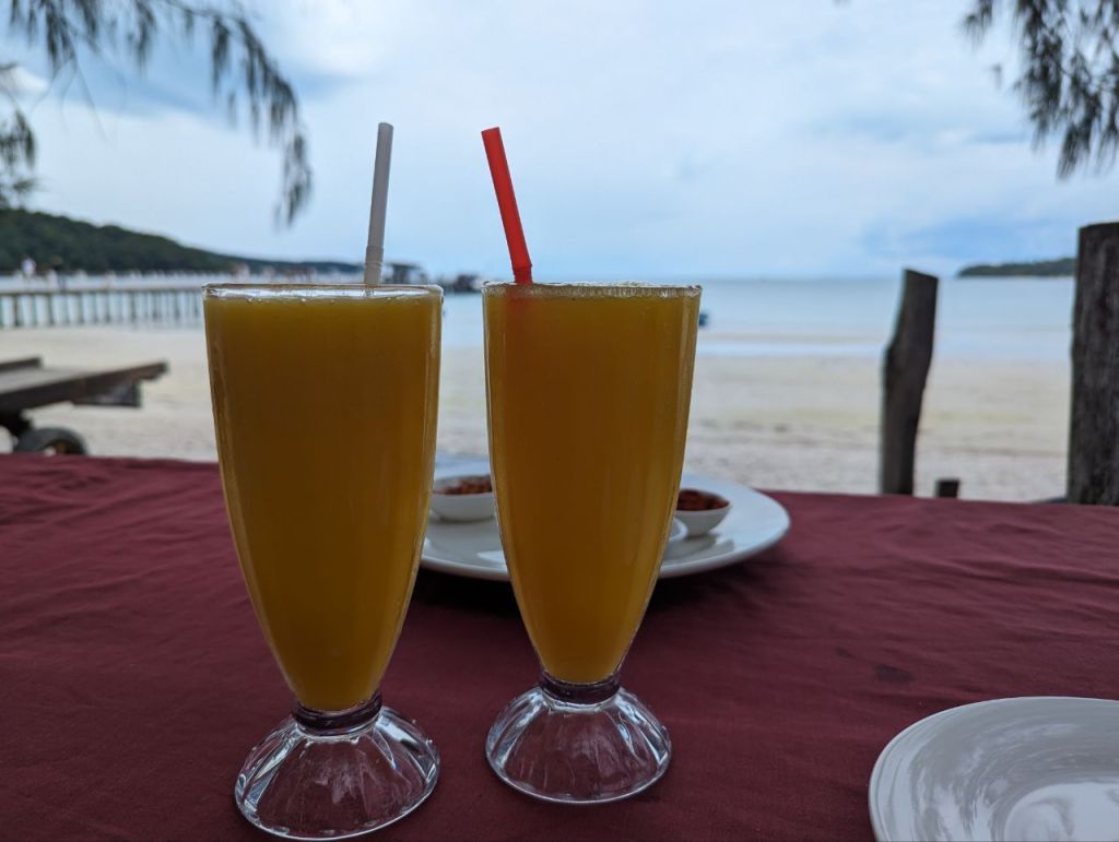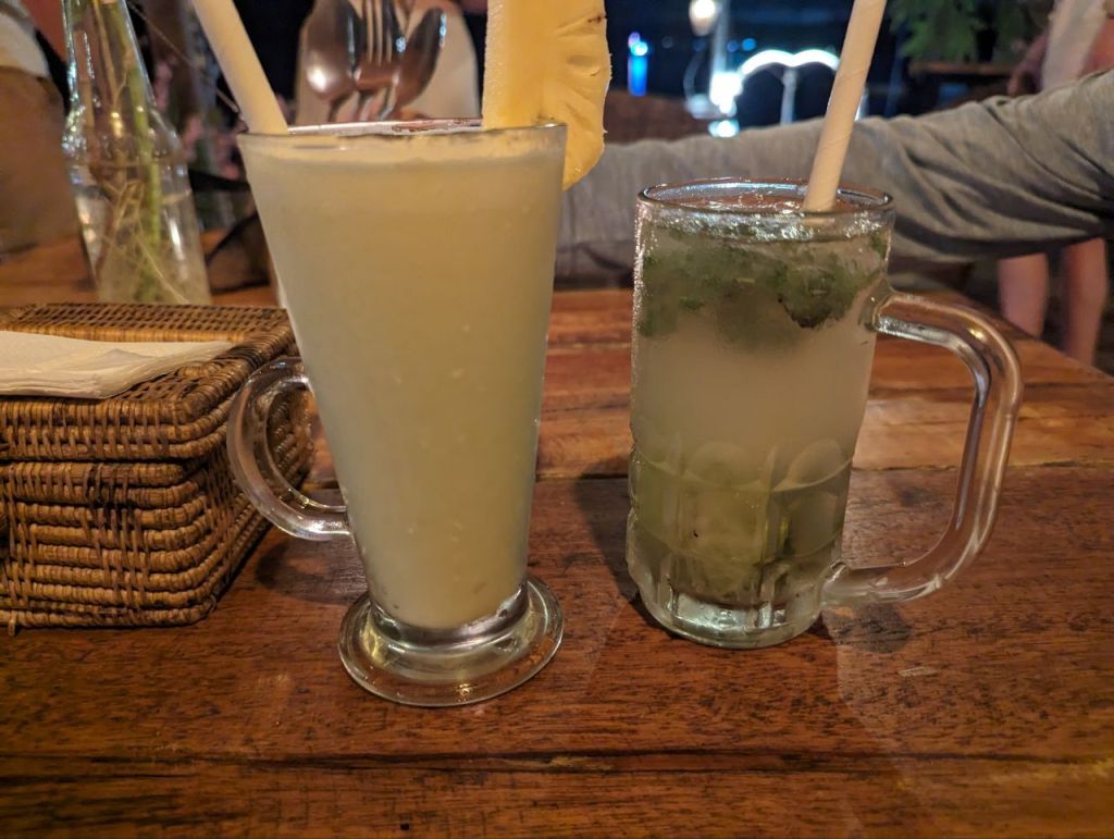 Abends bekommen wir endlich das Nationalgericht Lok Lak in der Tofu Variante. Ist ganz okay. Dazu mittelmäßige Cocktails.