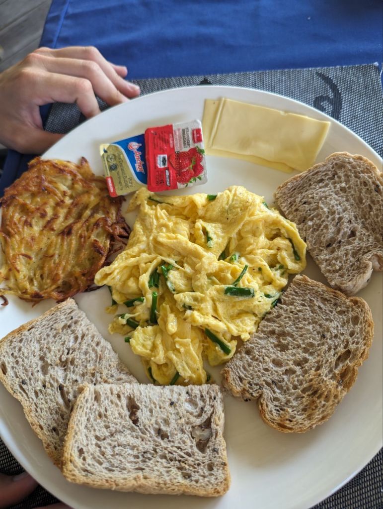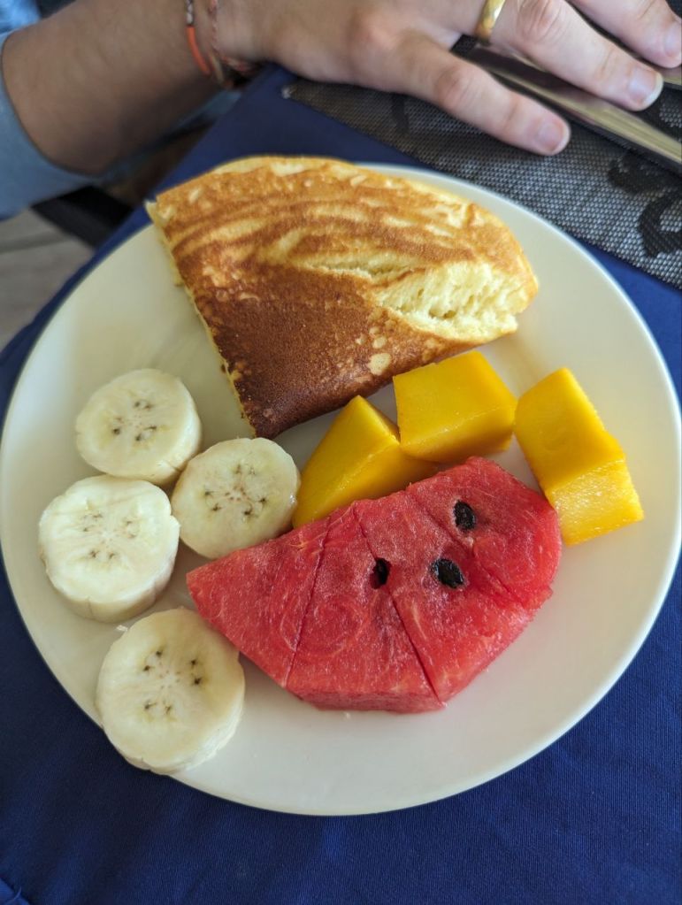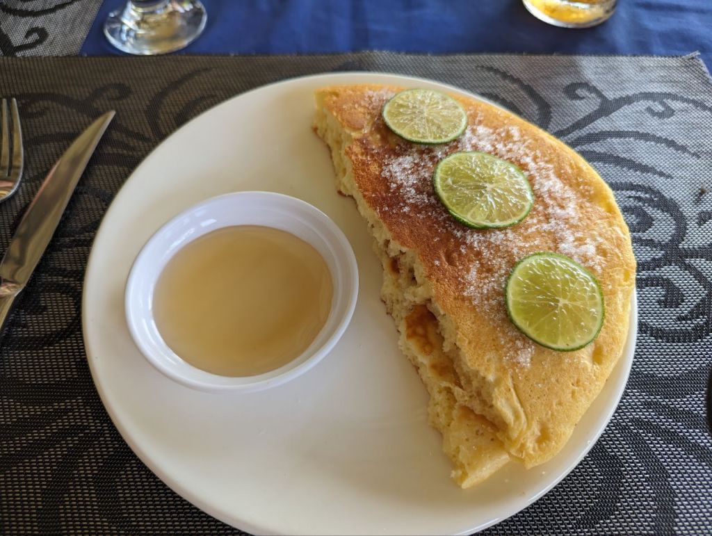 Auch heute steht Erholung auf dem Programm. Wir frühstücken im Resort und das ist üppig. American Breakfast und Lemon Pancake.