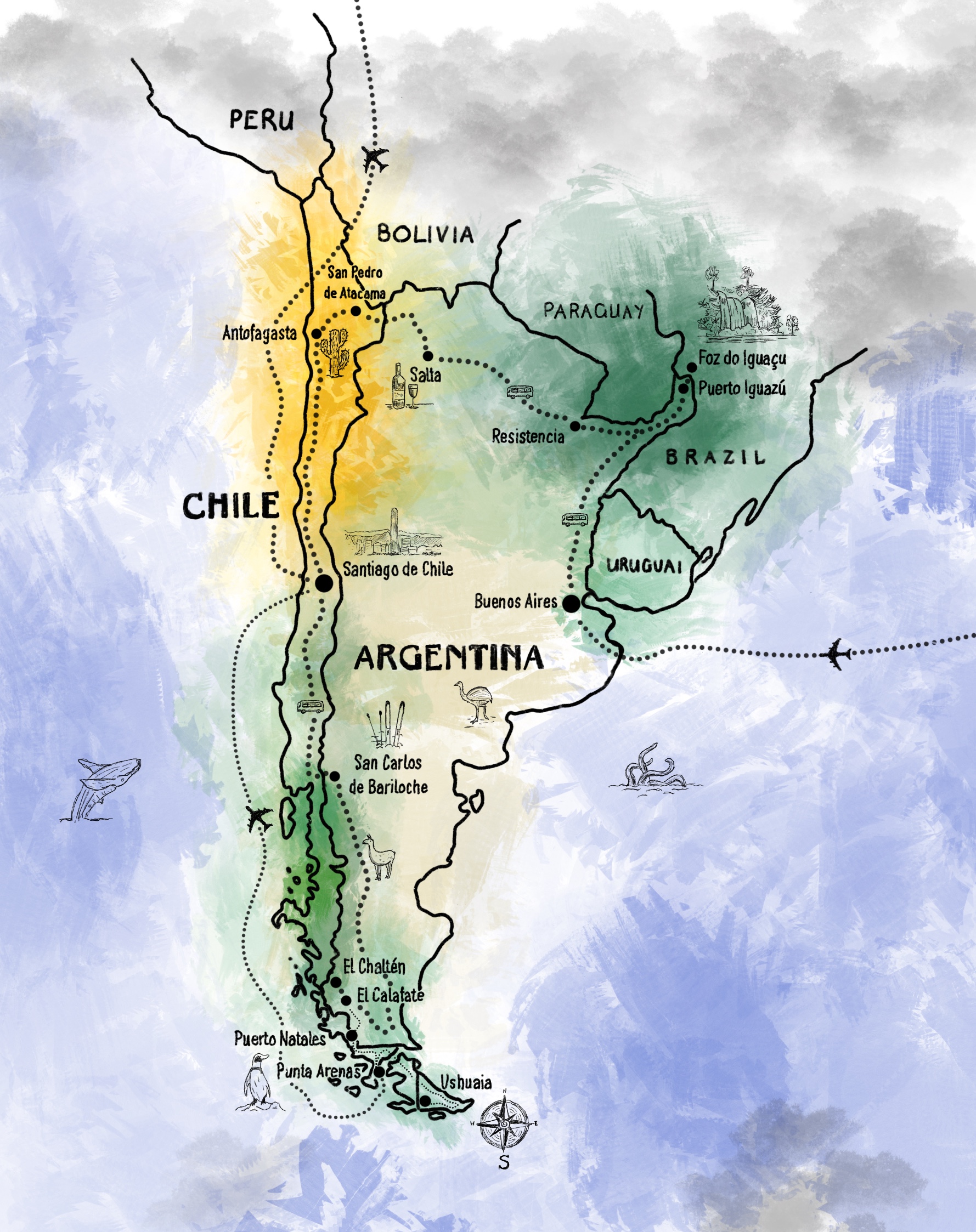 Ein vollständiger Überblick mit ganz vielen Fakten. 3 Monate durch Südamerika. Begonnen haben wir in Buenos Aires, dann ging es zu den Iguazu Wasserfällen und in die Atacamawüste. Danach fuhren wir quer durch Patagonien bis ganz in den Süden nach Feuerland.