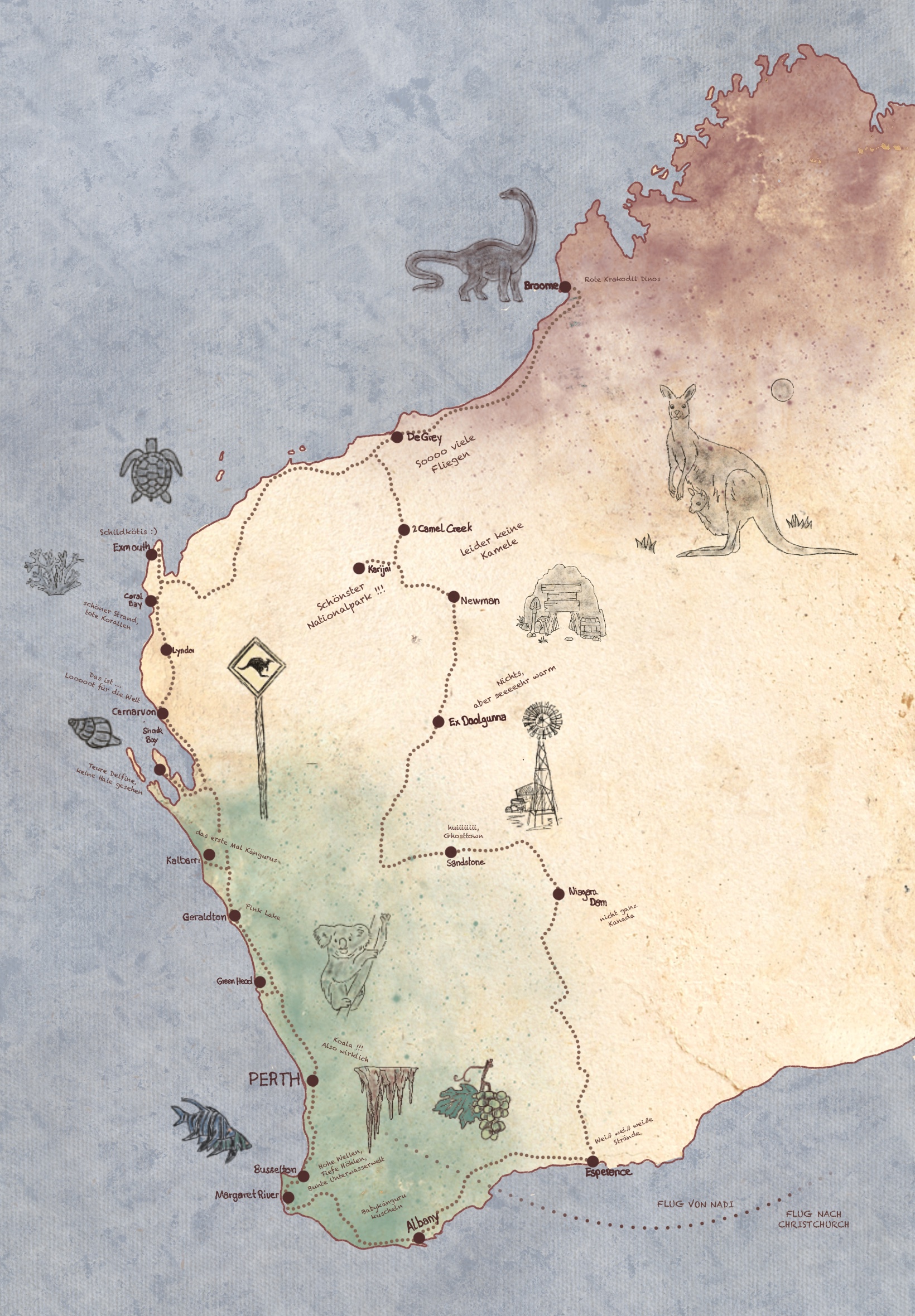 Roter Fels, Canyons, strahlend weiße Strände, Korallen und Kängurus – das ist Westaustralien. Und noch viel mehr. Wir haben es geschafft, sechs Kontinente haben wir in über 8 Jahren gemeinsam bereist. 5 Wochen verbrachten wir in dem wunderschönen, heißen Land.